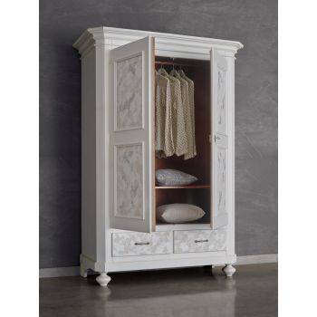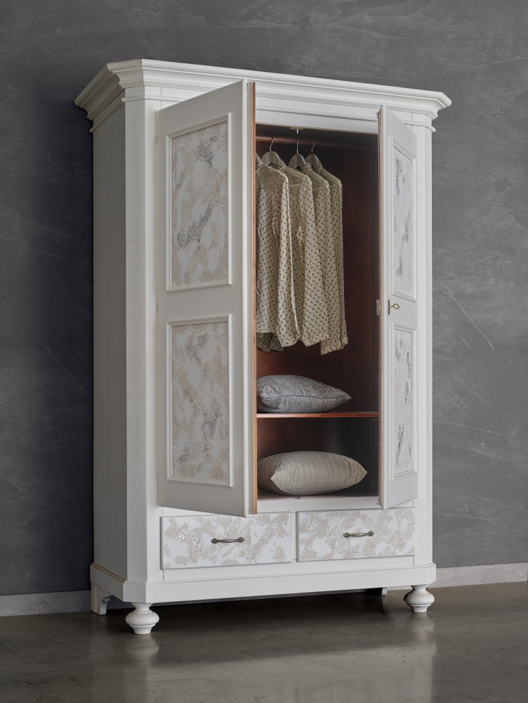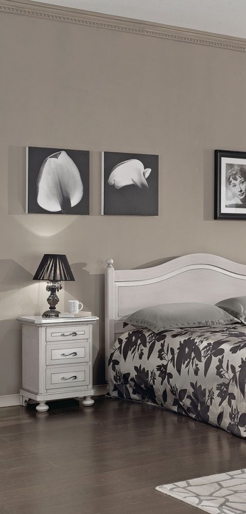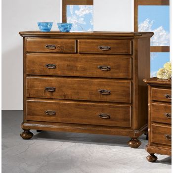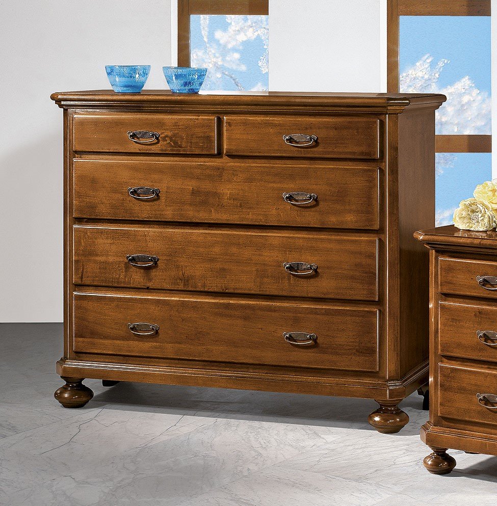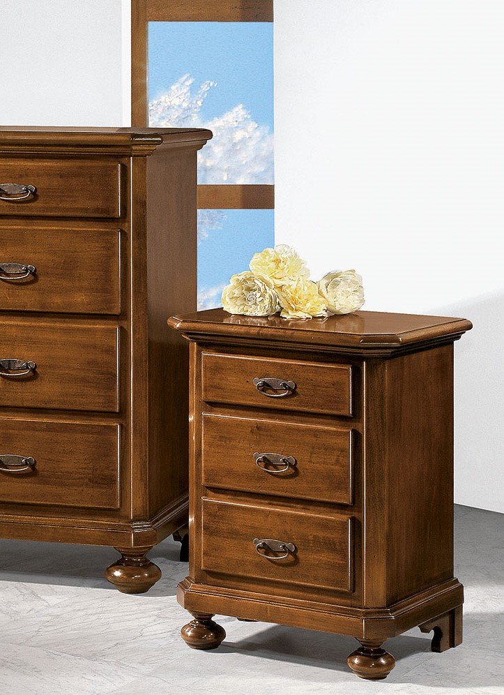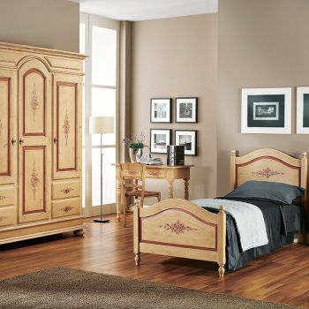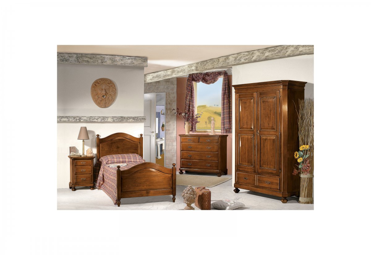 A warm and inviting atmosphere where traditional charm meets functionality. This bedroom set is crafted from solid wood with a cherry finish that highlights the natural grain. The single bed features a curved headboard and footboard with turned finials, evoking a Tuscan rustic style. The three-drawer nightstand and spacious chest of drawers provide generous storage, complemented by the two-door wardrobe with bottom drawers for added organization. With its timeless design and attention to detail, this composition is ideal for classic and country-style interiors.