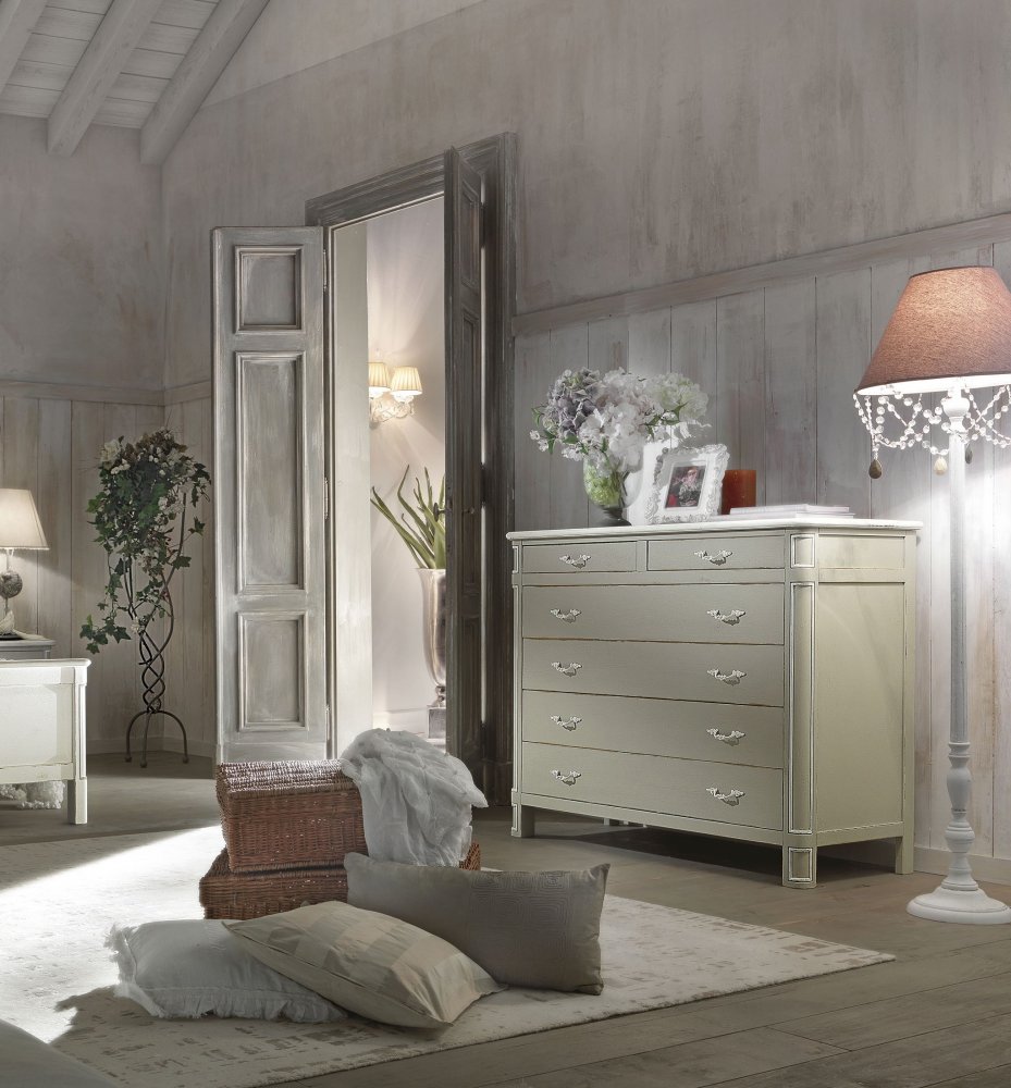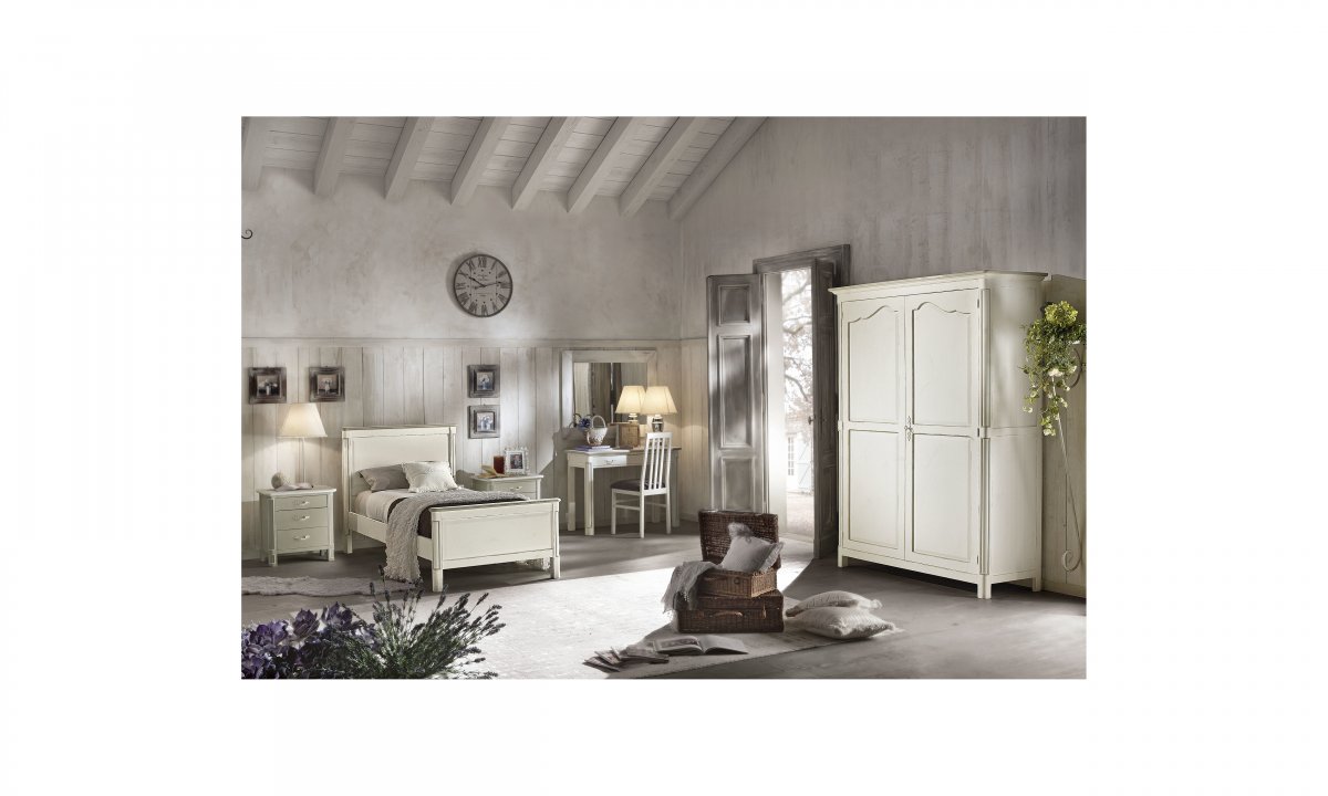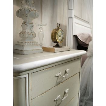 This Provençal-style bedroom blends romantic elegance with refined craftsmanship. The focal point is the canopy bed, crafted in creamy white lacquered wood and framed by soft, flowing drapes that add a delicate, graceful touch. The nightstands and chest of drawers feature slender legs and carved detailing, offering a classic look with a country-chic twist. The patinated finish and light color palette—ranging from buttery whites to pearl greys—create a bright and relaxing ambiance. Ideal for rustic homes, countryside retreats, or anyone who wants to bring a hint of Provence into everyday living.