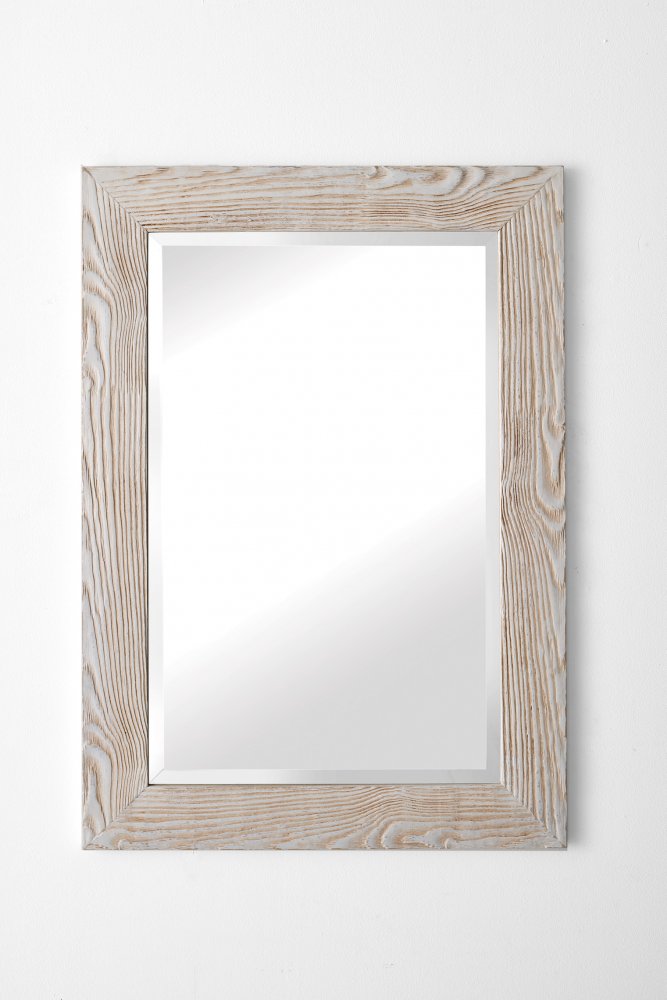 Specchiera rettangolare laccata con finitura colore bianco effetto sabbiato con vetro molato.