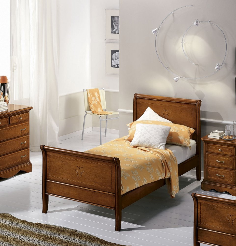 Pannelli della testata e della pediera: pannello in multistrati impiallacciato in legno di noce intarsiati con legni di varie essenze.