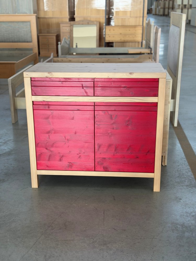 Credenzina 2 porte 2 cassetti bicolore con struttura abete naturale spazzolato e porte e cassetti rosso